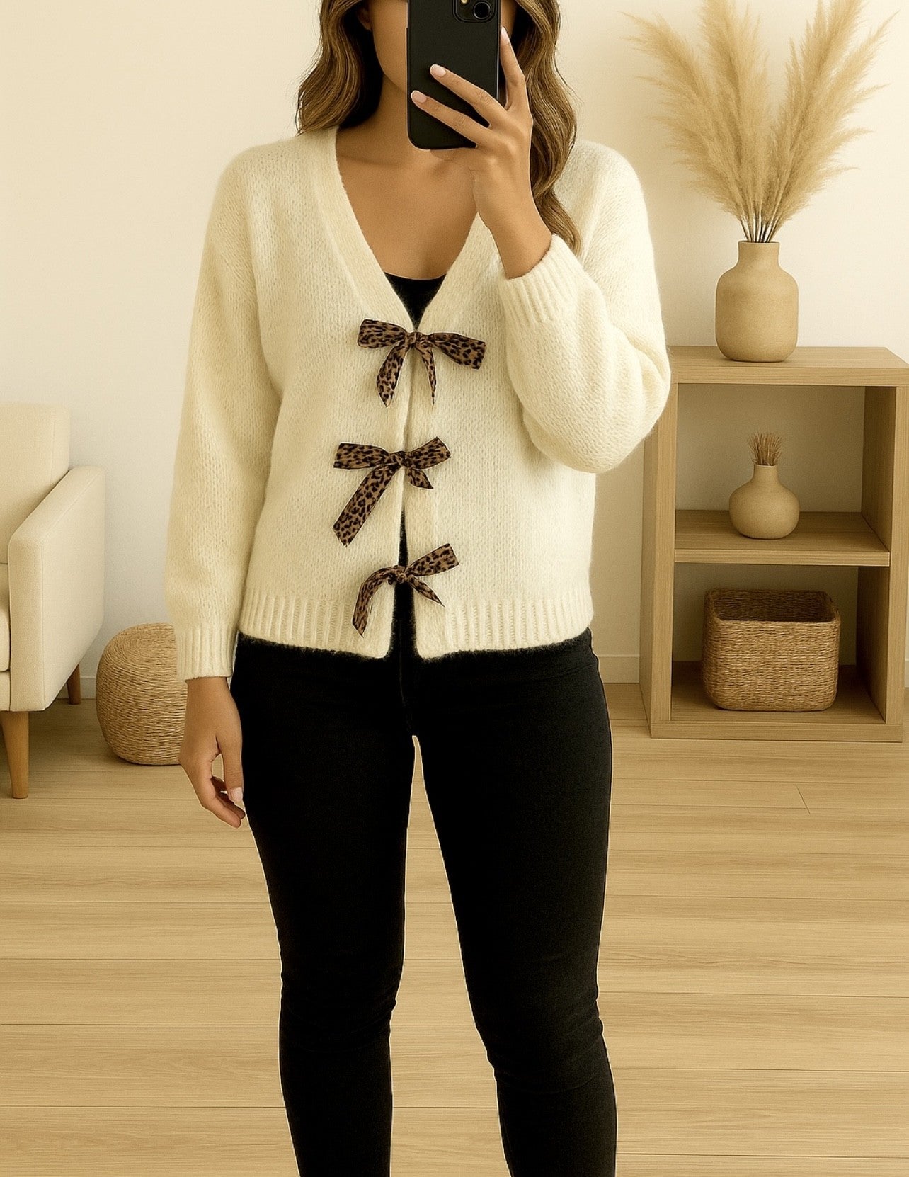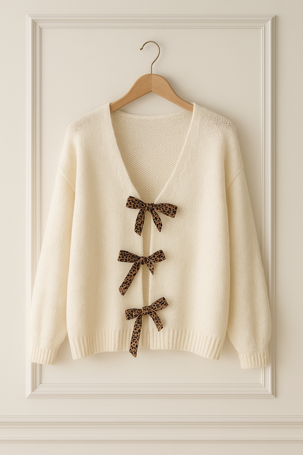 Apportez une touche de fantaisie chic à vos tenues avec ce gilet crème ultra doux, orné de trois nœuds en ruban léopard qui font toute son originalité. Une pièce unique et délicate, parfaite pour se démarquer tout en restant confortable.