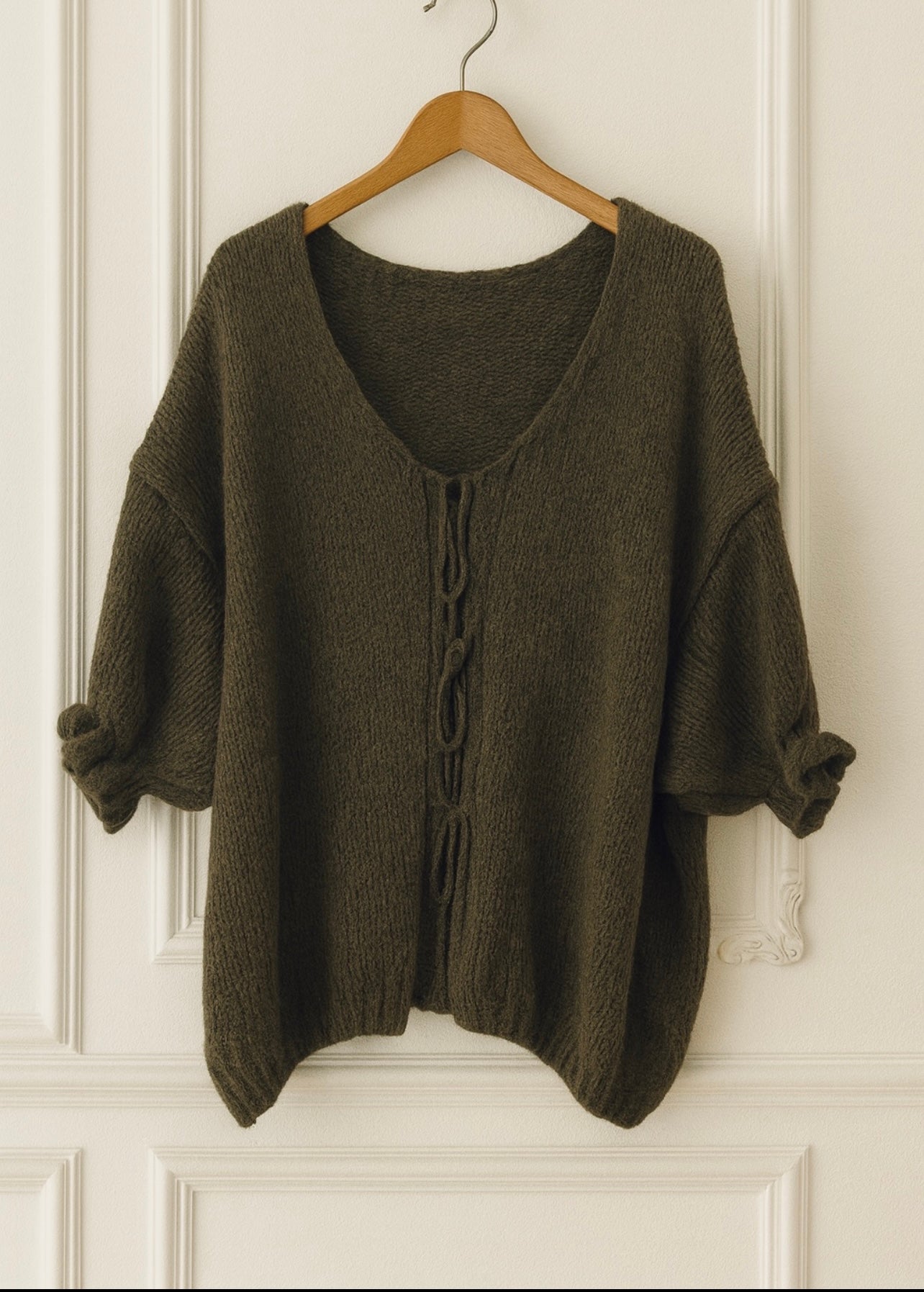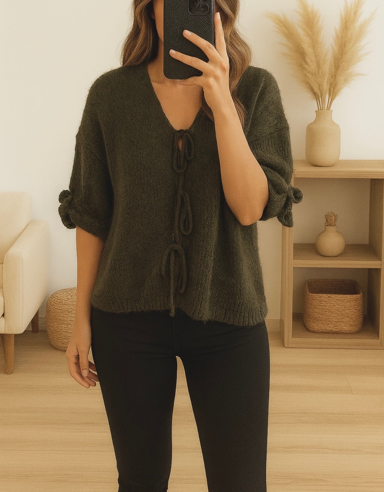 Un gilet doux et confortable, couleur kaki, avec ses nouettes élégantes à l'avant. Facile à porter au quotidien, il s'associe aussi bien avec un jean qu'avec une jupe pour un look chic et décontracté.
