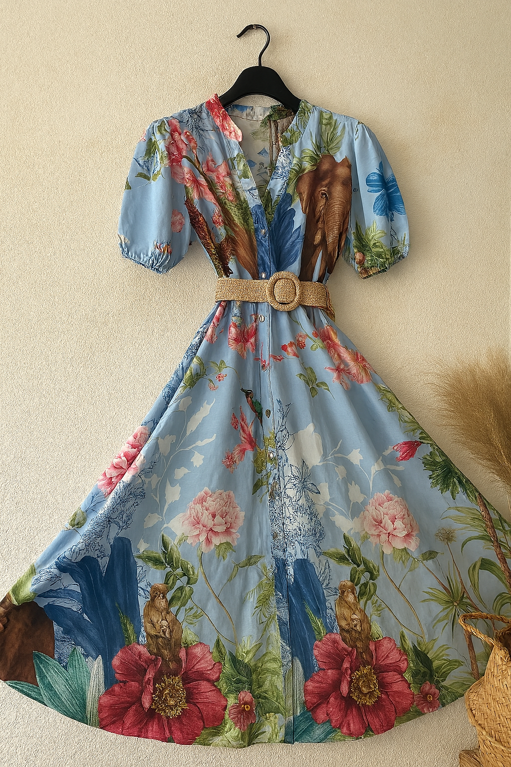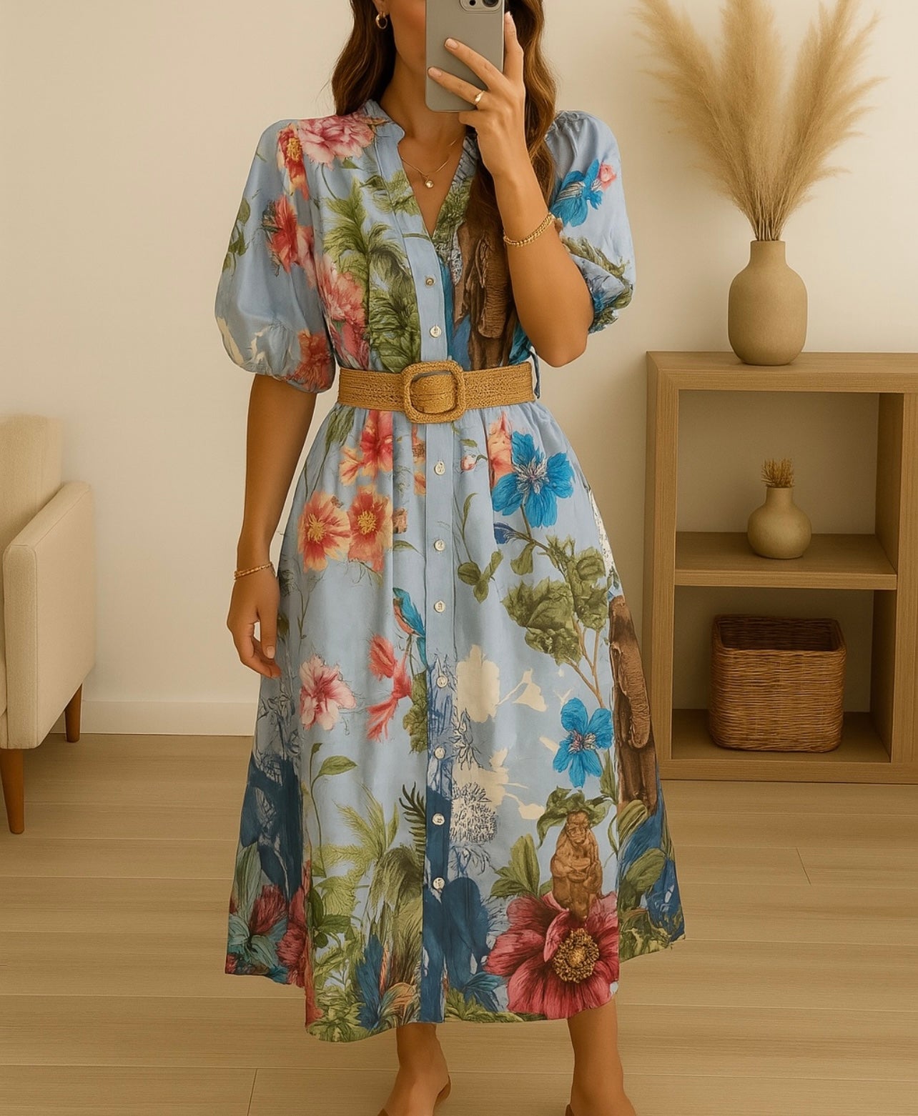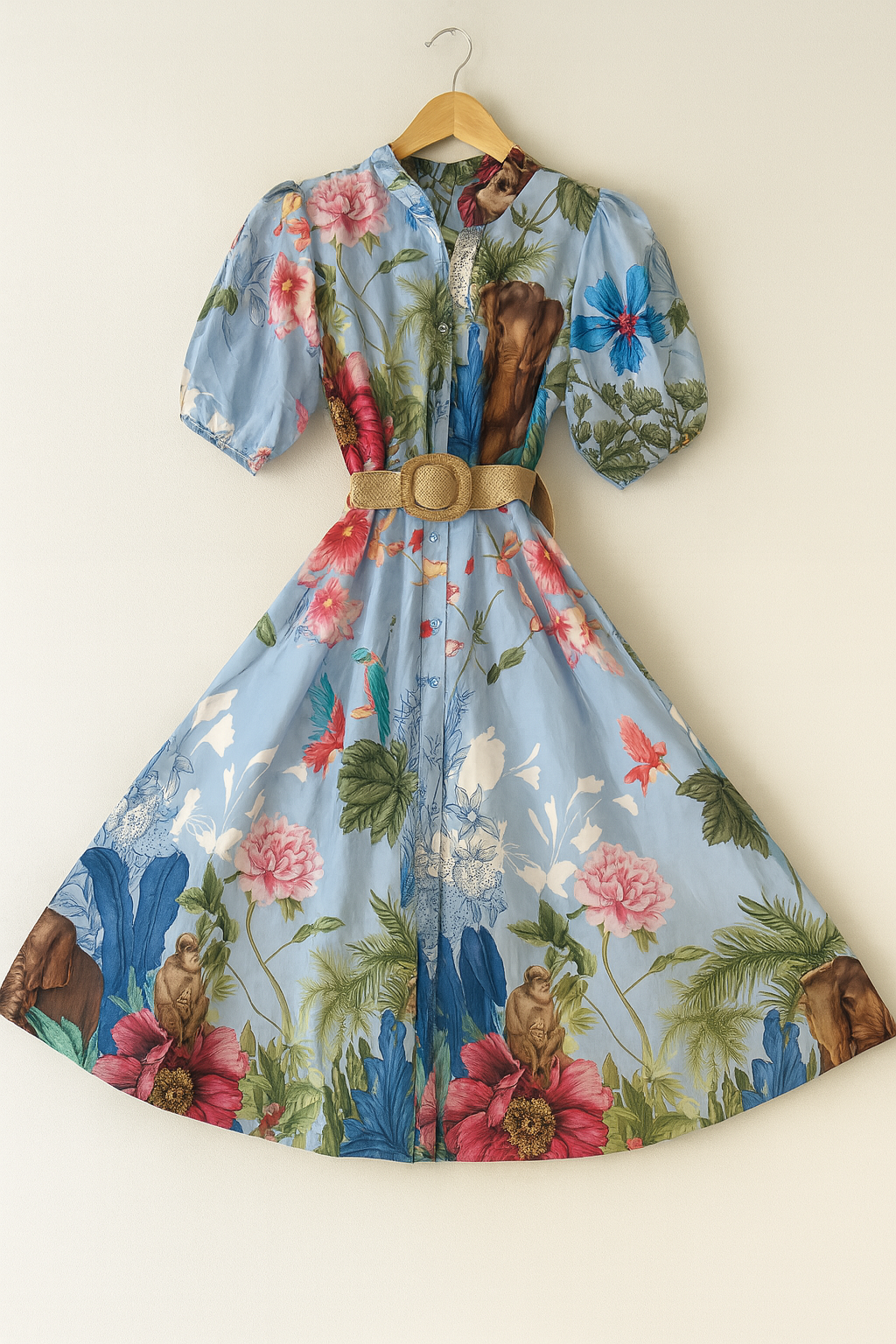 Cette robe chemisier longue séduit par son imprimé floral éclatant sur un fond bleu ciel. Sa coupe fluide et ses manches bouffantes lui confèrent une féminité subtile, tandis que la boutonnière intégrale et la ceinture tressée marquent délicatement la taille pour une silhouette élégante et raffinée